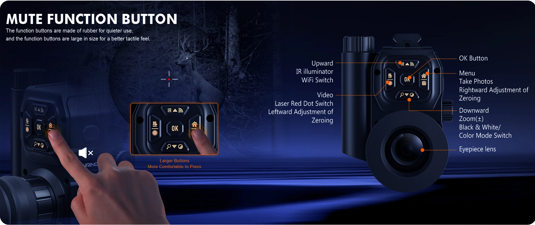 Silent buttons, with large and soft contact surface, easier to press. The shortcut button operation allows you to quickly set up functions without entering the menu.